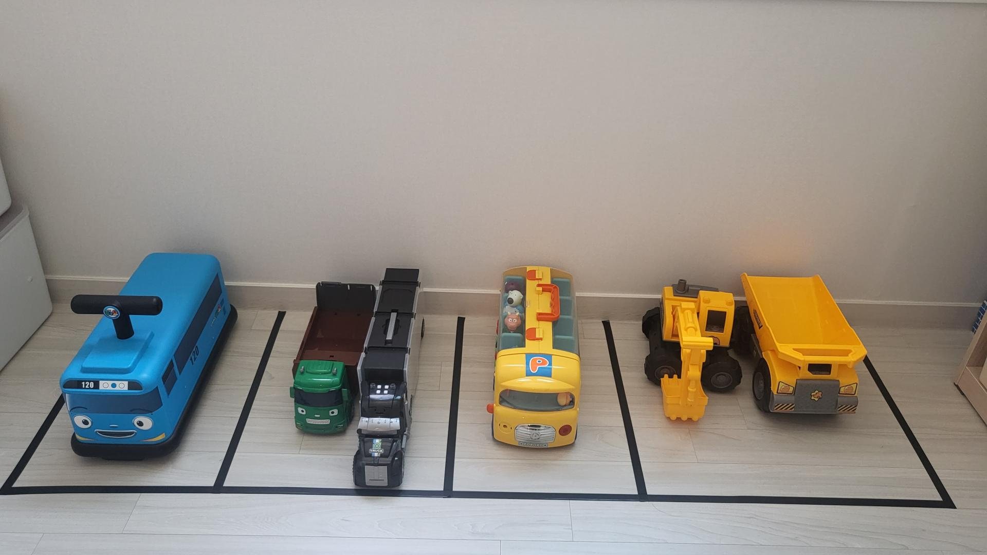 그래서 전기테이프로 작은 주차장을 만들었어요.