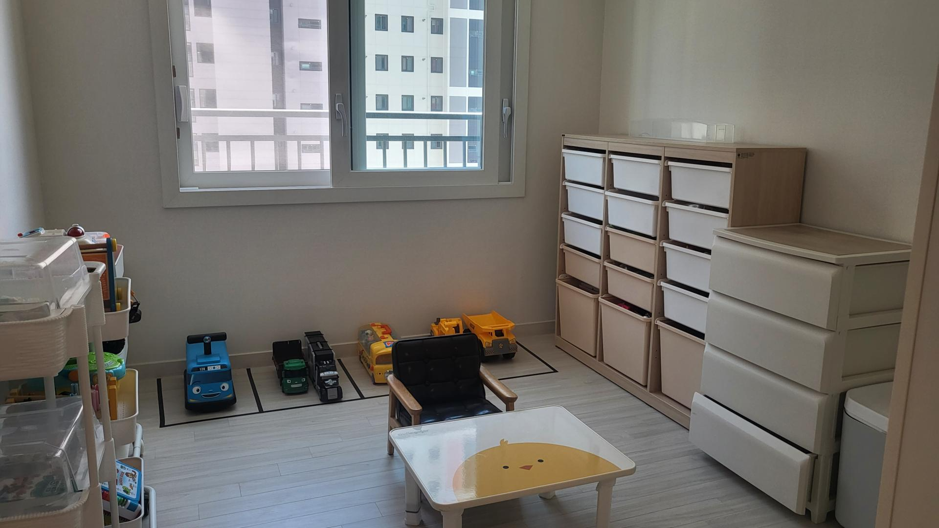 놀랍게도 정리된 방에 온 5살 아이가 장난감 차들을 하나하나 주차선 안에 가지런히 넣고 있었어요